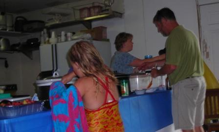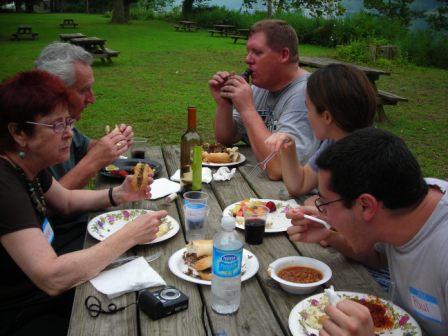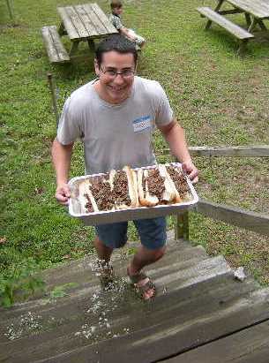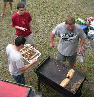 | Mark Ruddy and Paul Brachman assist John Musial making Philly cheesesteaks. | Paul delivers the steaks to the waiting crowd. |